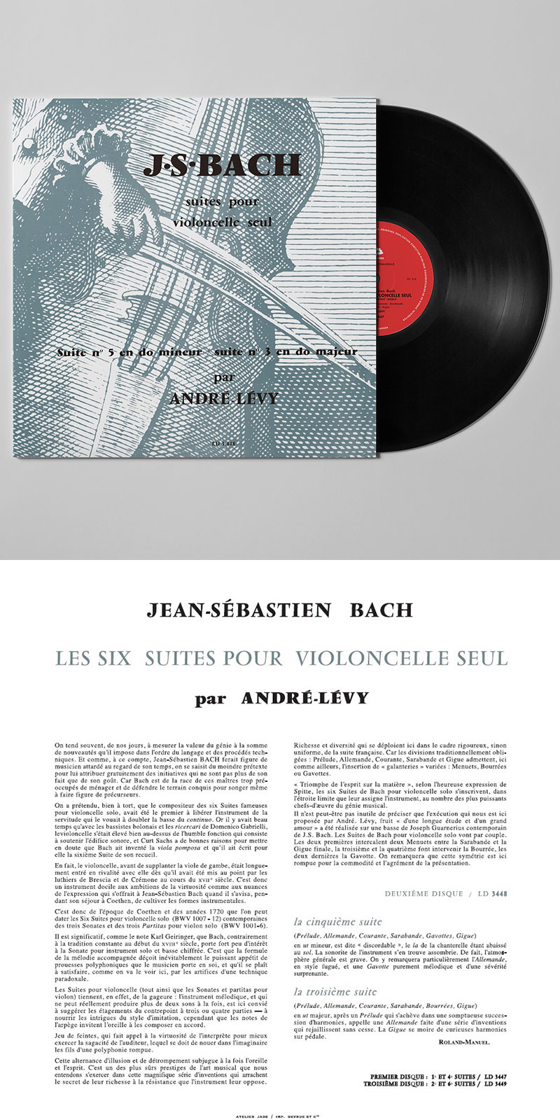 앙드레 레비가 1959년부터 1960년까지 프랑스 뤼망 레이블과 녹음한 이 바흐의 첼로 모음곡 전곡은 1961년 당시 300~400세트 정도 초반 LP가 발매되었지만, 현재 감상에 적합한 수준의 음반은 거의 남아 있지 않는 것으로 알려져 있다. LP 컬렉터들에게 늘 선망의 대상인 레코드이며, 희귀 LP 중의 희귀 LP로 프랑스 Lumen 레이블의 초반을 복각하여 2022년 새롭게 리마스터링되어 발매된다.