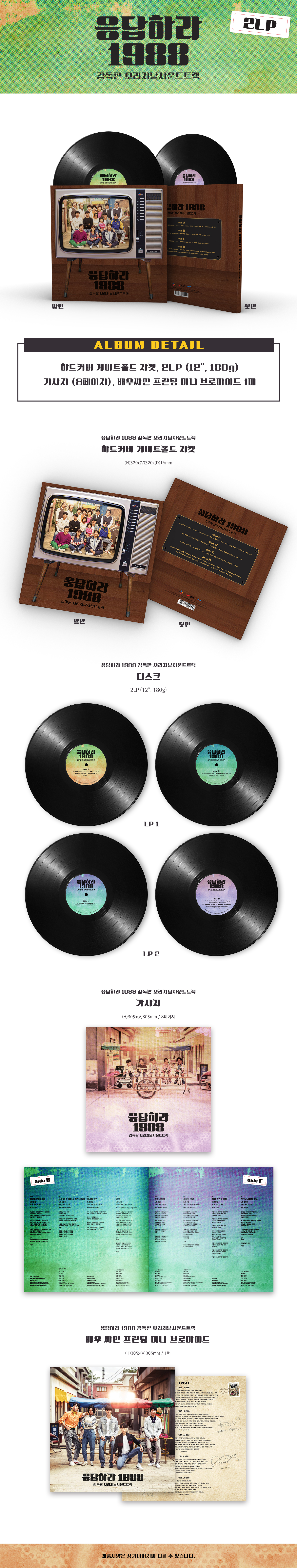 ‘응팔 감독판 OST’의 전곡이 게이트폴드 자켓의 2 LP로 수록되며, 이너 슬리브, 해설지와 함께 ‘추억 소환’ 미니 브로마이드를 포함 ‘응답하라’ 시리즈의 팬들은 물론 LP 애호가들 및 입문자들에게도 충분한 소장 가치와 함께 높은 만족도를 선사할 전망이다.